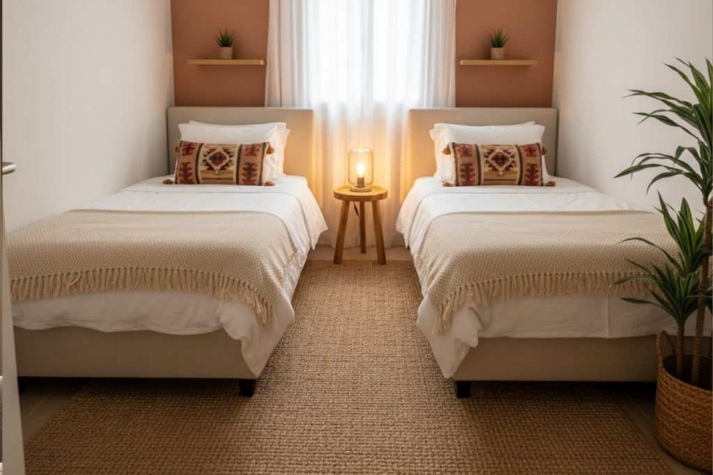 Una cama en cada pared formando ángulo. La esquina se “lee” como un sofá de día si añades cojines. Te deja un rectángulo libre para escritorio o armario. Coloca una alfombra única que una el conjunto y evite que se vea troceado.